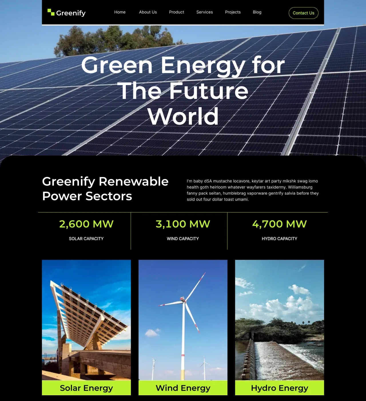 Renewable energy companies face unique challenges in communicating their complex services and environmental impact online. The Greenify template addresses this with a bold, high-contrast design that makes technical information accessible while maintaining professional credibility.