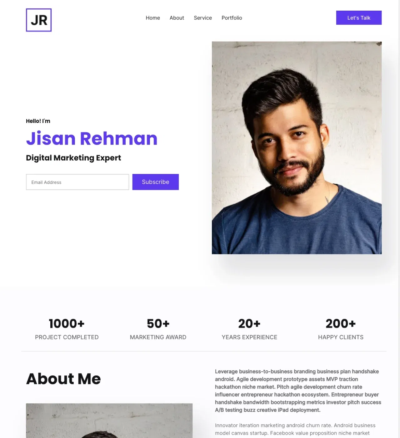 Built with a bold purple accent color and clean modern aesthetic, the design balances visual impact with readability. The homepage opens with a hero section that puts your professional identity front and center, followed by animated statistics that quantify your achievements—projects completed, awards earned, years of experience, and satisfied clients.
