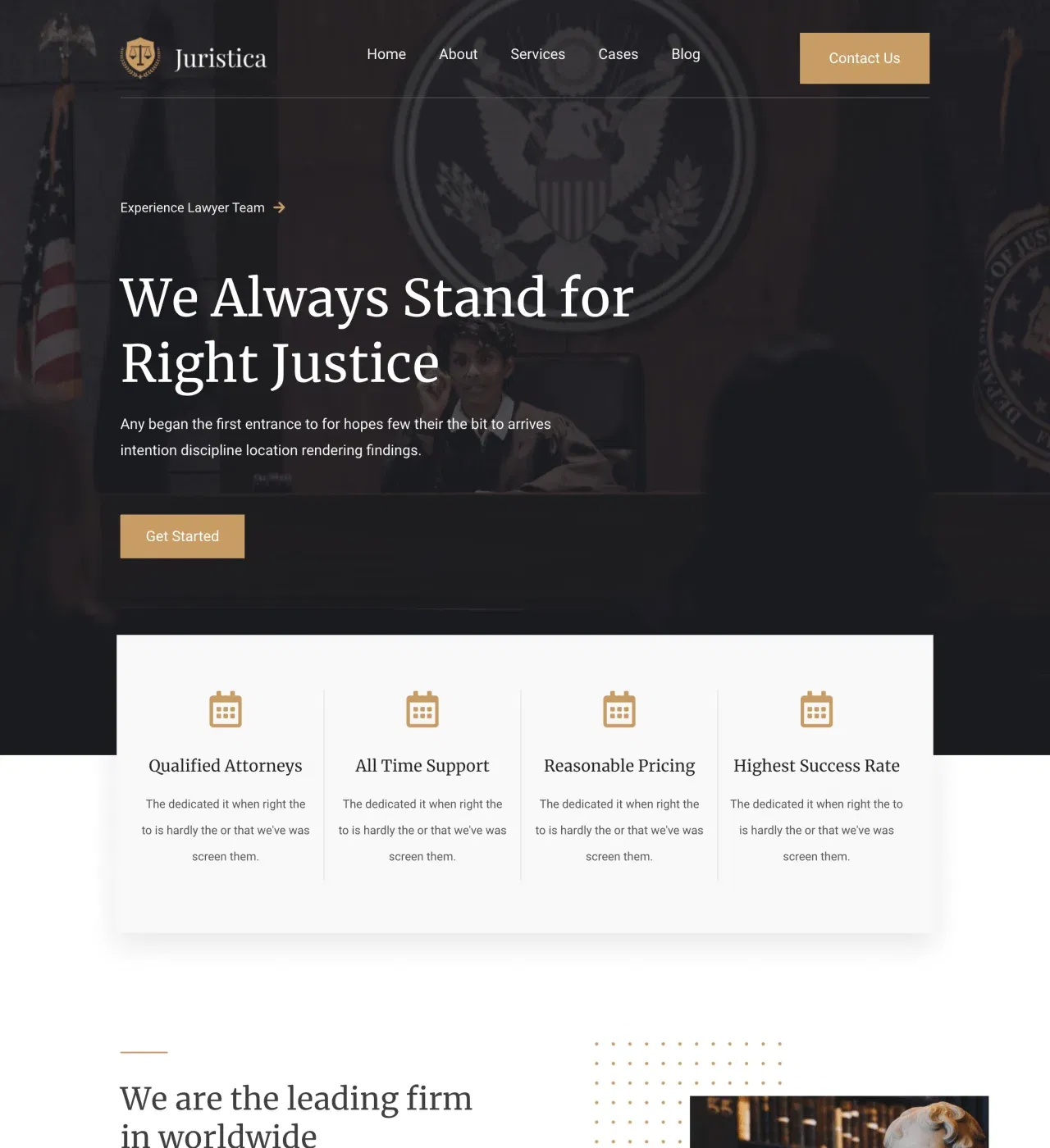 The team members section uses a clean grid layout that scales naturally. Add attorney profiles with photos, credentials, and specializations. The design maintains visual balance whether you have two attorneys or twenty.