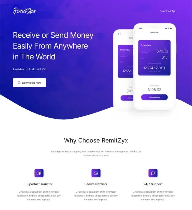 Absolutely. Built mobile-first, Remitzyx ensures perfect display and functionality on smartphones and tablets—critical since many fintech app users browse and download exclusively on mobile devices. The responsive design automatically adapts to all screen sizes.