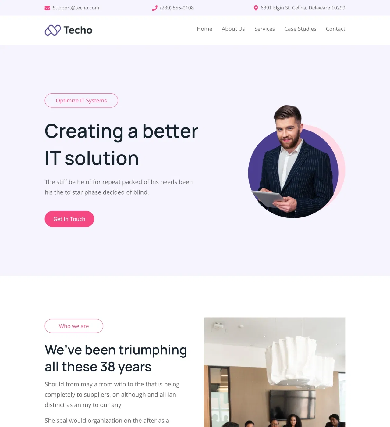 Techo solves this with a structured approach that highlights what matters most—your services, proven results, and team expertise. Service detail pages let you explain solutions thoroughly, while case studies demonstrate real-world impact. Team member profiles humanize your company and showcase the experts behind your solutions.